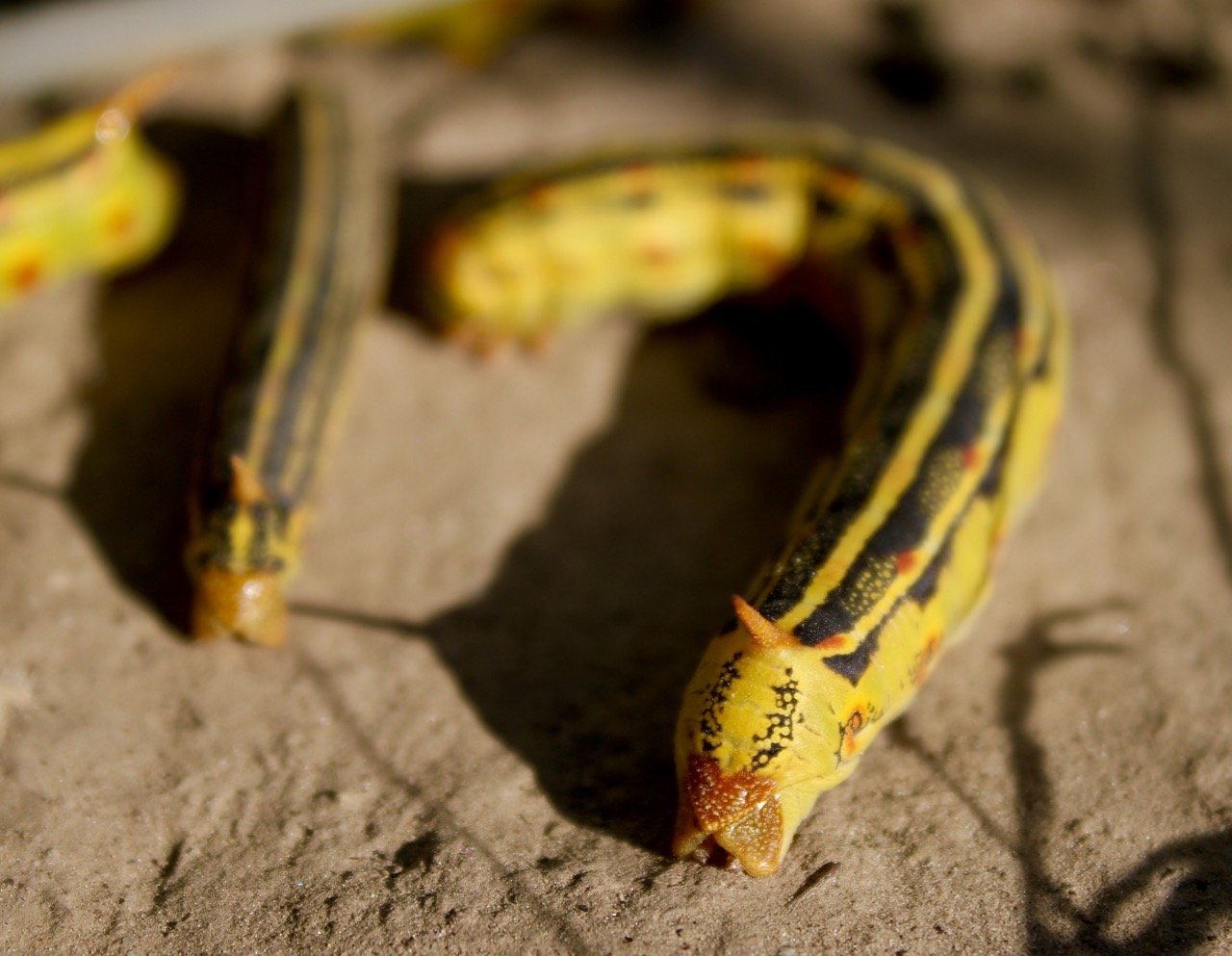 They were everywhere, the caterpillars of the white-lined Sphinx moth, in a field of wildflowers at Anza-Borrego Desert State Park in southern California. I saw one, then noticed more—and more. Some plants had as many as four chomping away at their flowers. What seemed like different species of bug turns out to be the same, Hyles lineata. Their population skyrockets when there is a corresponding explosion of flowers—a ‘superbloom’—like there was this year, one of the rare spectacles that my wife and I got to experience. These guys are voracious though. In time, they’ll eat everything in their paths.