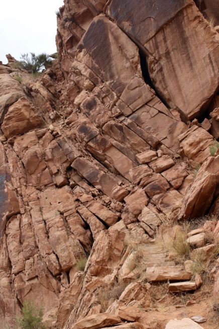 As if dinosaurs and rock carvings weren’t enough, DNM also has another noteworthy distinction. Of all lands under National Park Service jurisdiction, it contains the most complete geologic record, spanning 1.2 billion years. All the rock layers known to science except three are represented here. I was amazed at the stratigraphic variety even in the small section of the park we visited. More dramatic than that, many layers were contorted, folded, broken or tilted. Continental drift and the upheaval that caused the creation of the Rockies, known as the Laramide orogeny, did a number on the landscape.