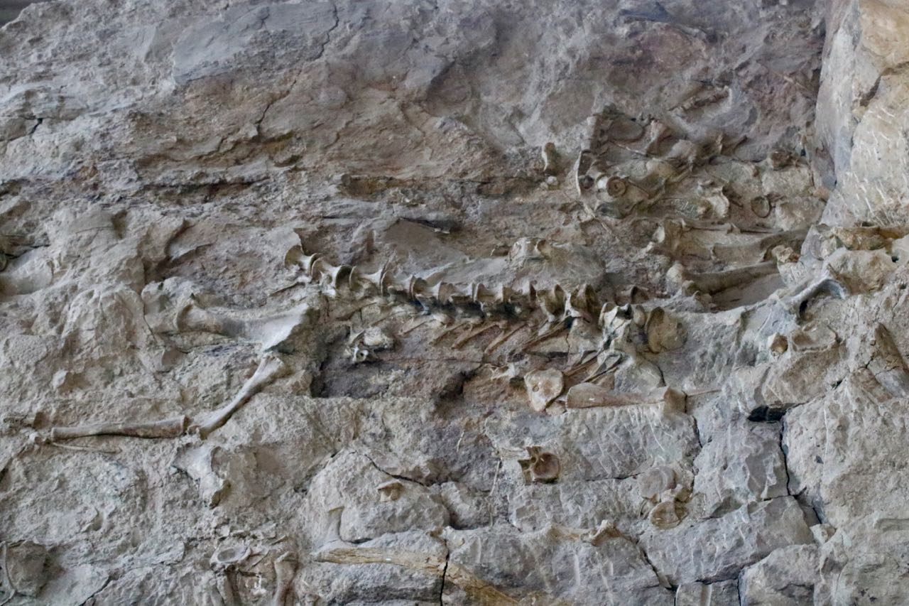 The monument features a treasure trove of in situ fossilized dinosaur bones, approximately 1,500 of them, in the Dinosaur Quarry. Never completely excavated, the fossils were left in place partially exposed along a hillside, called the Wall of Bones, that is now completely enclosed in a modern, air-conditioned building where visitors can admire specimens up close.