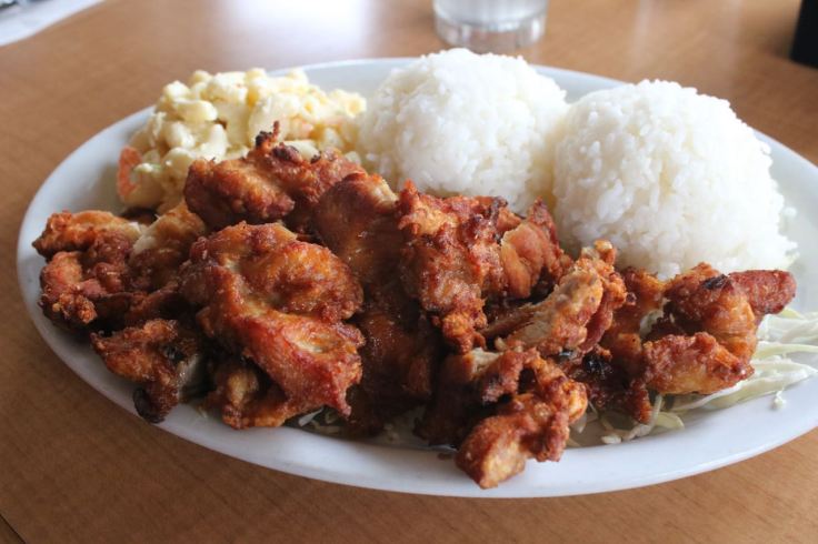 Mochiko chicken is marinated and sweetened with sugar, batter and fried. Kona Kitchen’s is good, with hints of ginger, served with two scoops of white rice and a very good mac salad. A few nuggets were a bit dry.