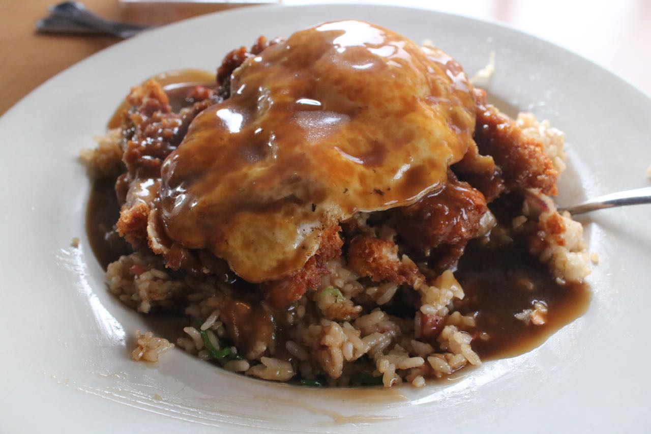 I had lunch at Kona Kitchen recently, which many consider the best Hawaiian restaurant in Seattle. On the menu was the classic loco moco. For lunch, there’s also katsu loco. Instead of ground beef, rice is topped with battered and fried chicken thighs. More than that, you have the option to substitute fried rice for white. Yowza! To me, this sounded much more appealing.
