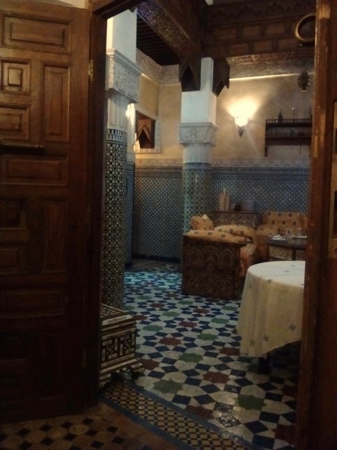 Fouad was confident that I would thank him when he picked my wife and me up from our riad to have dinner at his restaurant. He said it was a two-hour drive when it was only 15 minutes. We walked into Fes’ old medina near the tanneries (our noses told us) and up into a dark, narrow alley, which we’d never have found on our own. Once we walked through the front door, it was another world, a beautifully decorated dar and restaurant with linens and silverware.