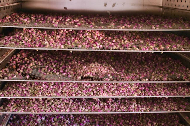 The faint perfume that I smelled in the courtyards of many riads came from a basket of dried rose buds. They’re sold in bulk at all the spice stalls (image above). Originally from Syria, the Damascene (Damask or Damascus) rose is an important crop grown commercially in the M’Gouna Valley. Berber women manage the rose co-ops. Our driver Mustapha took us to a shop in Kelaât M’Gouna where the process from picking to distilling the petals for making rose water and oil was explained. The backroom had faint hints of rose attar. I was fortunate to see the flowers in full bloom, which happens in April and May, bushes growing in almost every conceivable corner.