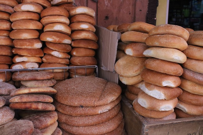 I find it hard to resist the aroma of freshly baked bread. It’s as likely to be coming from a commercial bakery as a eucalyptus or olive wood-fired communal oven (faraan) where women bring their unbaked goods. Bakery stalls in narrow streets of the medina are difficult to walk past without getting stopped dead in your tracks by a tantalizing whiff. The display cases or shelves are piled with freshly baked bread. Moroccans consume mountains of bread, especially khobz that always accompanies tajine. No meal would be complete without bread. Breakfast at the riads in particular were showcases for all manner of bread, flatbread and pastries. Besides khobz, there could be msemen, batbout, harcha, meloui, beghrir, small Napoleons filled lightly with chocolate. As I’m not partial to high-carb breakfasts or of yogurt, it became a challenge for me to eat contentedly in the mornings, unless there were eggs or cheese.