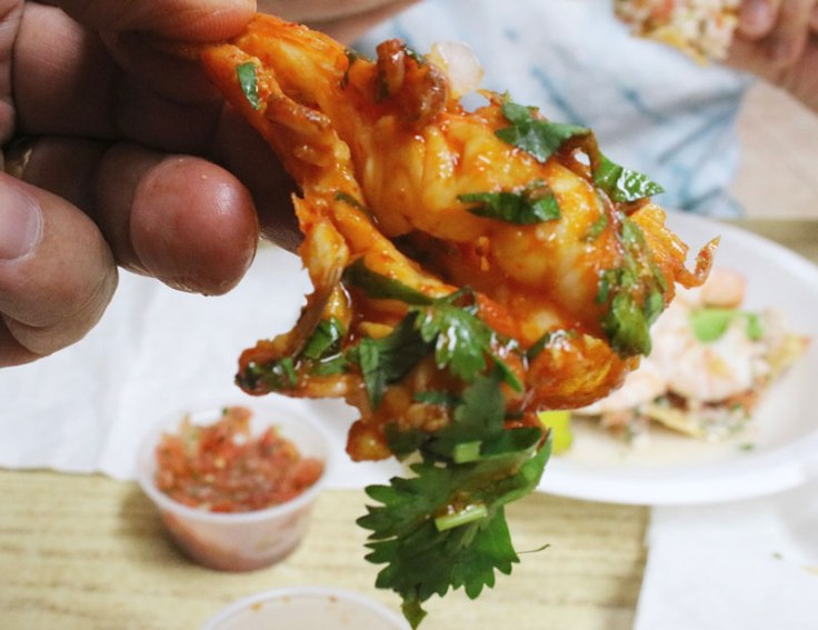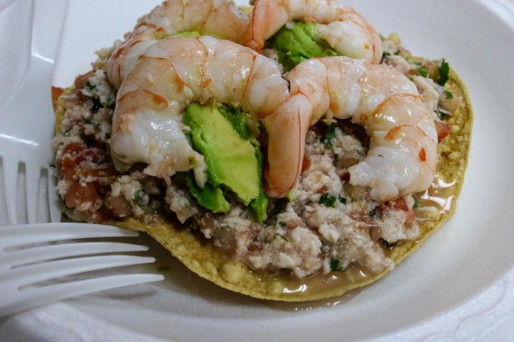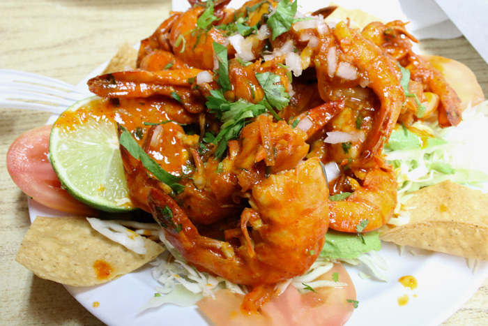 At the top of the seafood menu is Shrimp Botana, served ‘regular’ or spicy. A full dozen poached crustaceans, butterflied along the underside and in-shell, are piled on top of a cabbage-avocado-tomato slaw. There’s no way to eat these gracefully; it’s best to use your fingers. Besides, you’ll not want to waste time with decorum in getting these babies in your mouth.