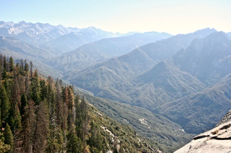 It’s a breathless exercise to climb the roughly 350 steps to the top of Moro Rock, which summits at 6,725 ft ASL. No, this is not the Morro Rock along the California coast but a granite monolith in Sequoia National Park. The effort to complete the climb of 300 feet is worth it for the views. If you’re prone to acrophobia, it’s likely you’ll not get very far, because the stairway winds tightly around the granite rock’s contours, one side sometimes facing the dropoff of a thousand or more feet, and the passageway occasionally is wide enough for only one person to pass.