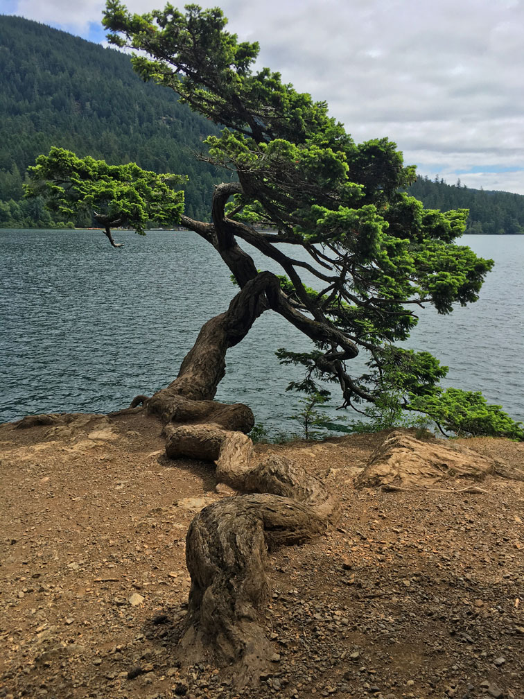 The Cascade Lake Loop on Orcas Island in Washington is a pleasant way to explore part of Moran State Park. Its most interesting feature is a twisted Douglas fir that seems out of place. The other evergreens all around it are straight and tall, making you wonder what traumas it withstood during its lifetime. Its shape mimics old junipers I saw in the Southwest.