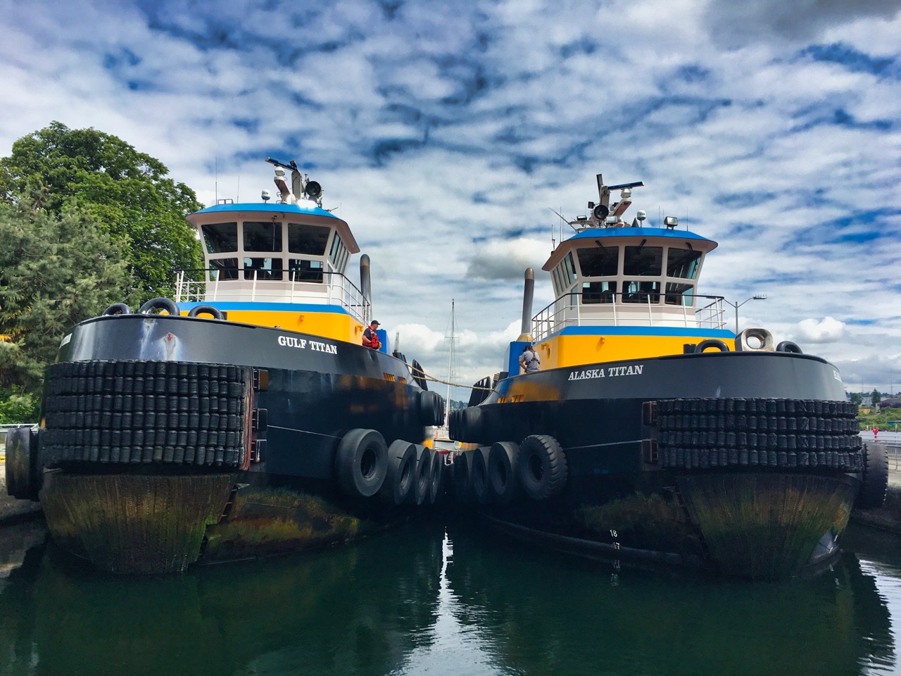 The main reasons to visit Hiram M. Chittenden Locks are the fish ladder to see the spectacular return of salmon and trout to their spawning sites and the passage of seagoing vessels through the locks between Salmon Bay and Shilshole Bay. The Ballard Locks, as it’s more commonly known, is one of Seattle’s top tourist attractions. There are many opportunities for photographers. A fortuitous one was this one where twin tugboats, the Gulf Titan and Alaska Titan, both built by the Western Towboat Company, were astride each other in the large lock.