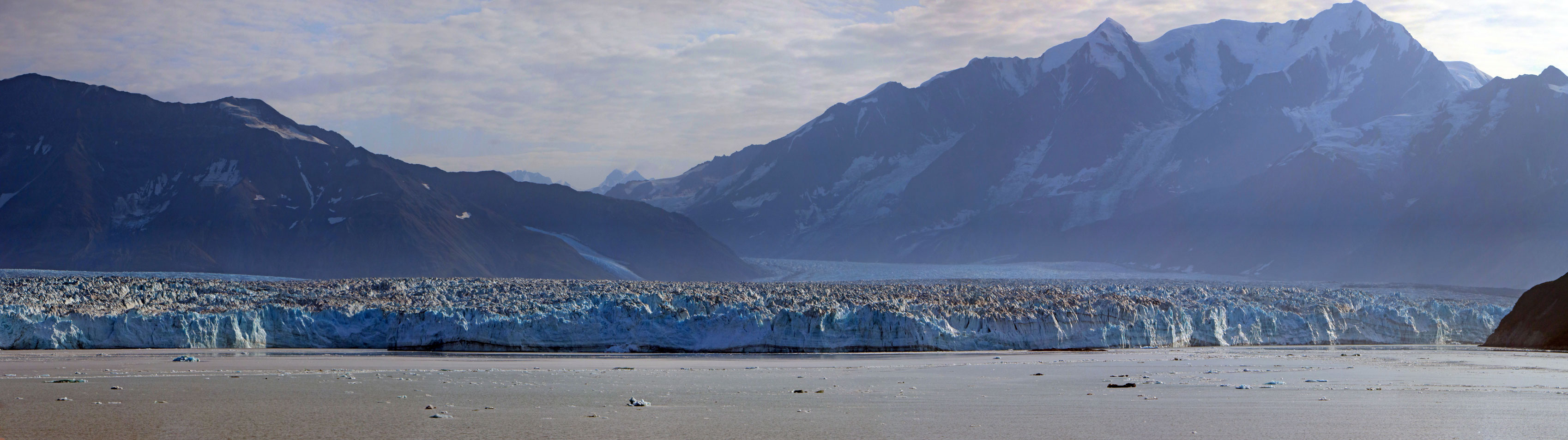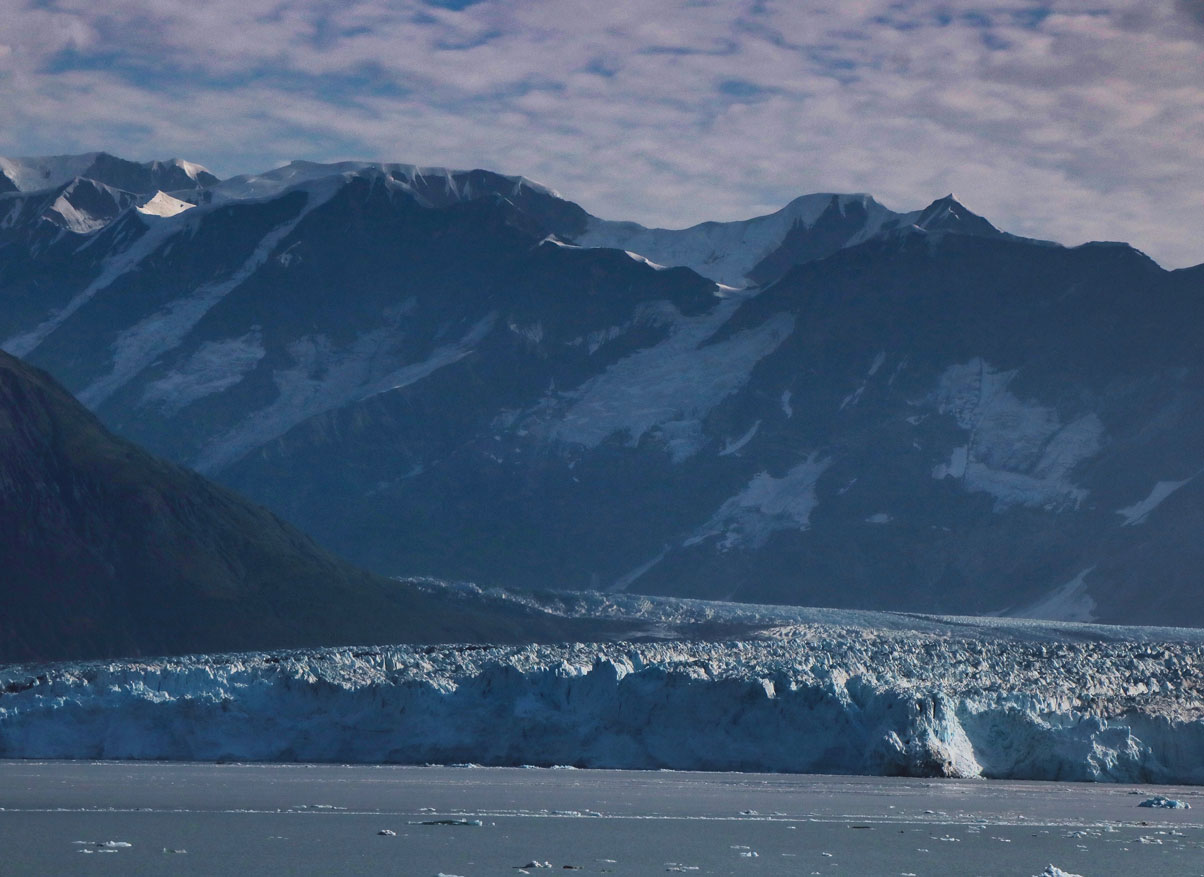 The first I saw Hubbard Glacier was from the upper deck of the cruise ship. The captain announced its approach over the PA system. Passengers positioned themselves wherever they could get a good look. I estimated that the vessel got no closer than a few miles because the glacier, the largest in North America at 6 miles wide at the terminus and 400 feet above sea level, seemed far off. (The images on this page were taken with a moderate telephoto lens.) Even with binoculars, I couldn’t see any activity. Still, even from a distance, Hubbard was impressive, living up to its reputation as one of the most spectacular attractions in Alaska. The cruise company didn’t offer a small boat excursion to get closer. I would love to have seen the calving of icebergs as they groan, crackle and thunderously collapse into Disenchantment Bay.