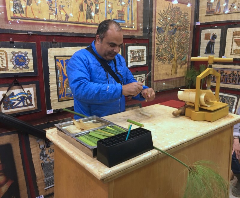 Among many of Waleed’s talents is his ability to make papyrus paper. At least, he did so in the past. At the Isis 2 Papyrus Museum in Luxor, he demonstrated how the paper is made. And how thoughtful of him to give us who didn’t buy anything a sample papyrus painting.