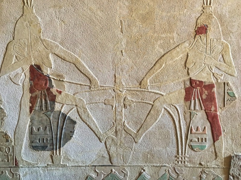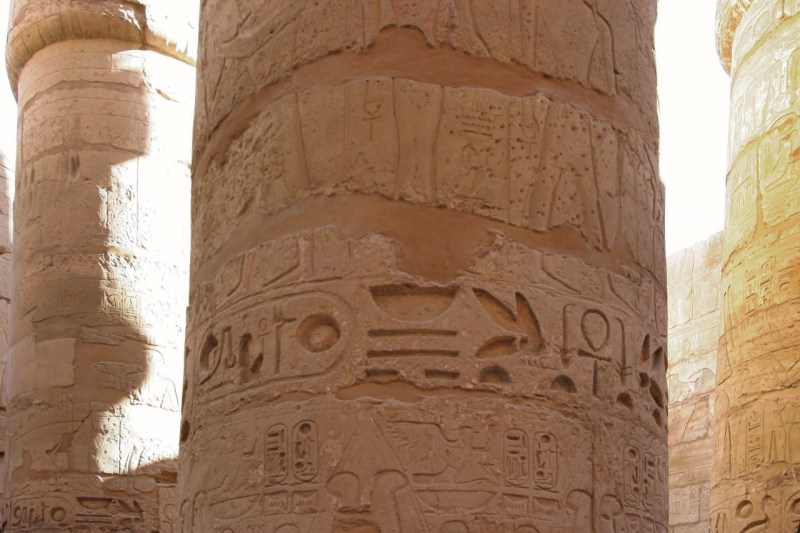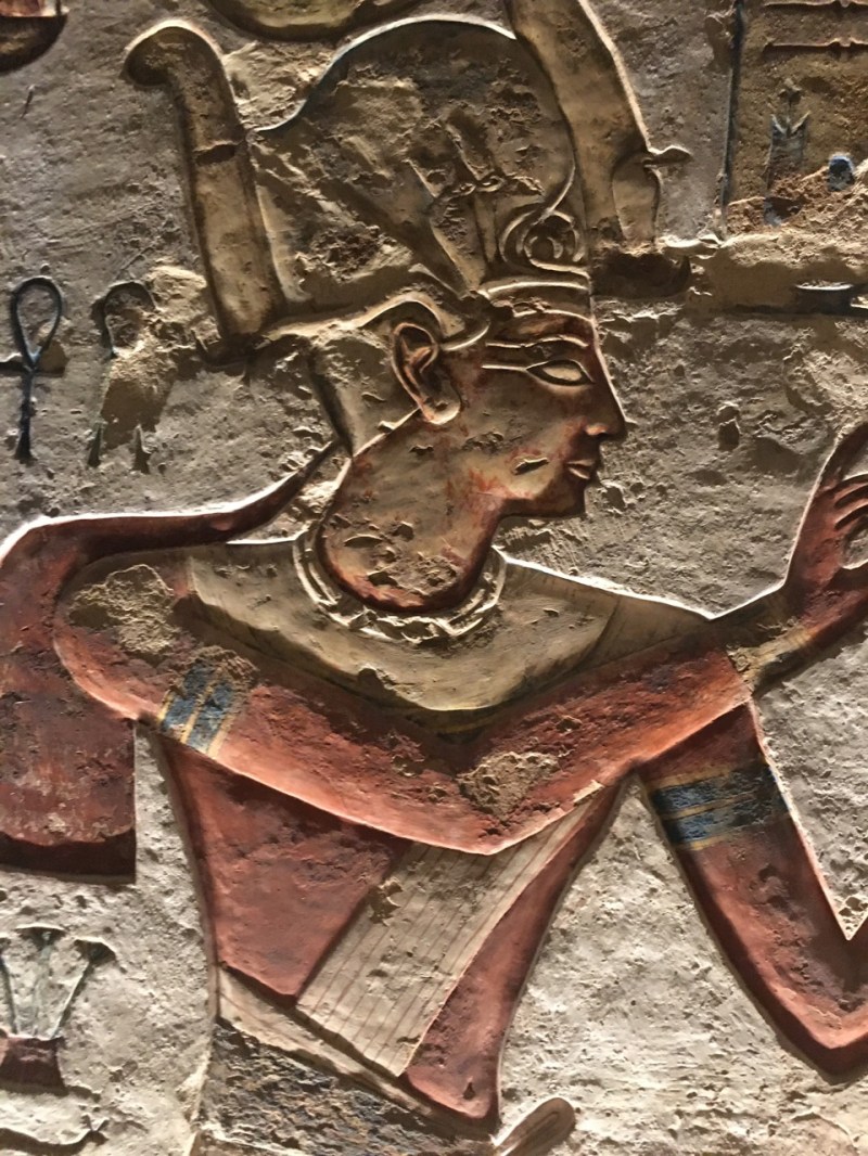One ticket allows visits to three tombs. Not all are open at any given time; only 18 can be visited at all. King Tut’s requires a separate ticket. I entered the tombs of Rameses III, Rameses IV and Rameses IX. In all of them, I stared in amazement at the ceilings and walls, beautifully decorated with religious images and texts. The colors are still vivid after thousands of years.