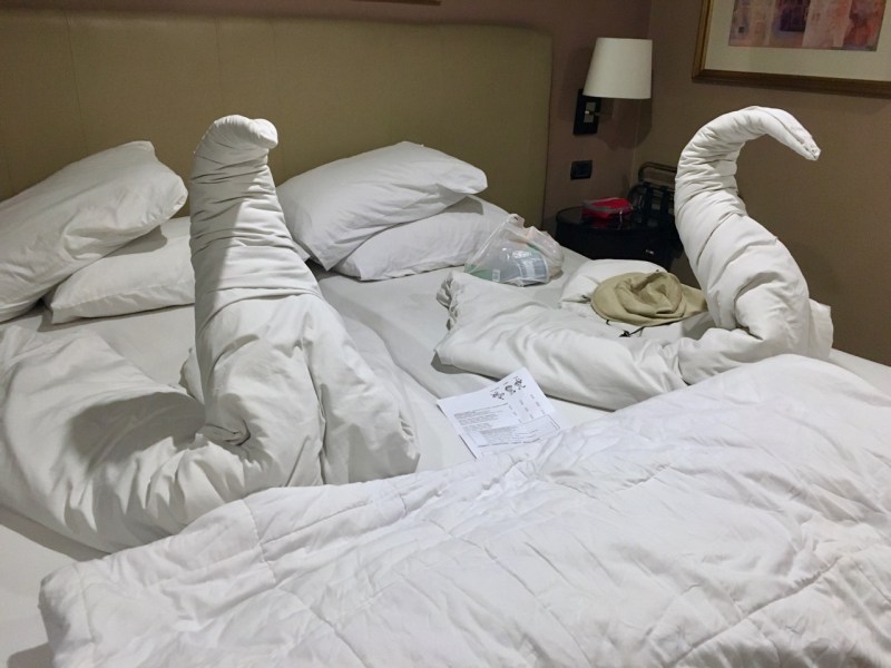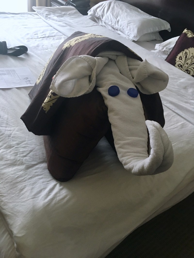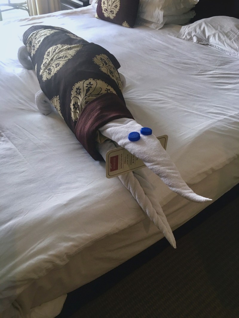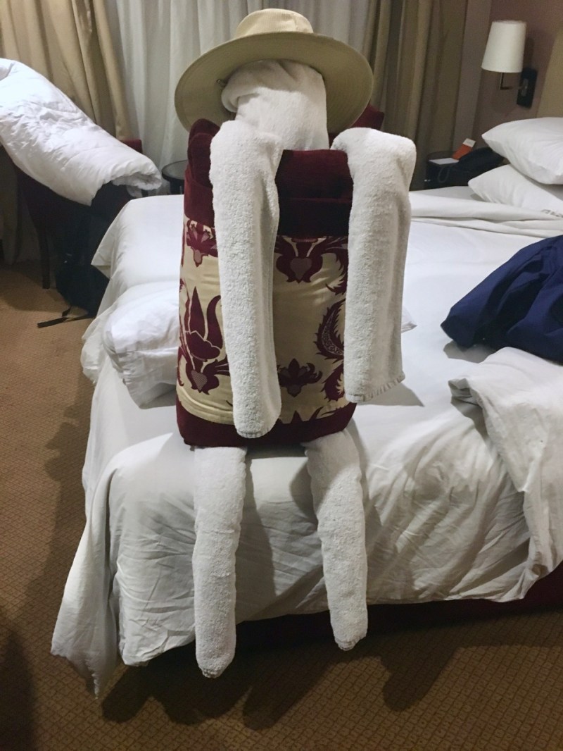 It must be an art form that housekeepers on cruise ships learn. I first encountered towel art on a cruise ship to Alaska. A bath towel and/or bed cover would be folded to create whimsical figures, typically animals, and placed on your stateroom bed. Anything else in your room to augment the main creation would be fair game. Our Egyptian counterparts didn’t disappoint.