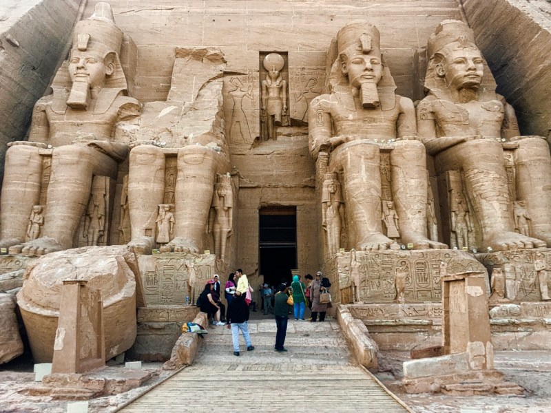 Rameses had more statues made of himself than any other pharaoh, all enormous. The most famous, of course, are at Abu Simbel, four of his humongous likenesses at 69ft in height in a seated position, while his wife, mother and children are miniaturized at his feet.