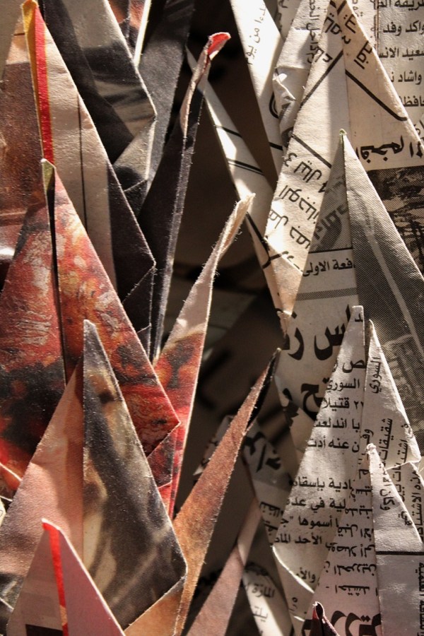 Artist Miri Golan advocates peace and understanding through her organization, Folding Together. In collaboration, Israelis and Palestinians create origami cranes from their respective language newspapers and string them together in the manner of Sadako Sasaki, the Hiroshima bomb victim who folded a thousand cranes. These were displayed at the Bellevue Arts Museum.